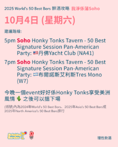 - 7pm Soho Honky Tonks Tavern – 50 Best Signature Session Pan-American Party: 🇦🇷布爾諾斯艾利斯Tres Mono (W7)