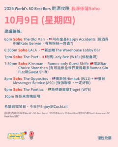 - 7:30pm Soho Kinsman – Ramos-only Guest Shift: 🇨🇳深圳Bar Choice Shenzhen (有可能係全世界賣得最多Ramos Gin Fizz嘅Guest Shift)